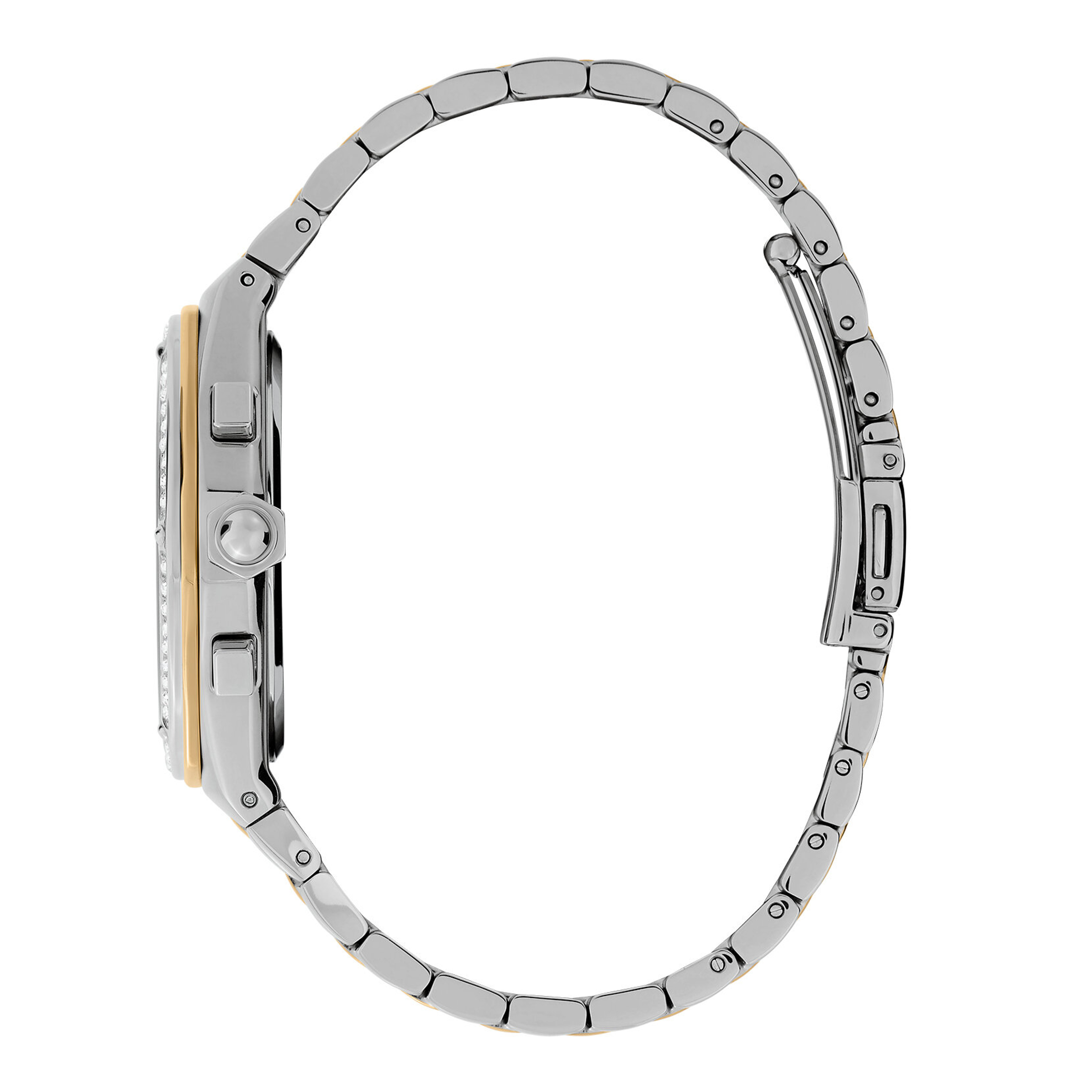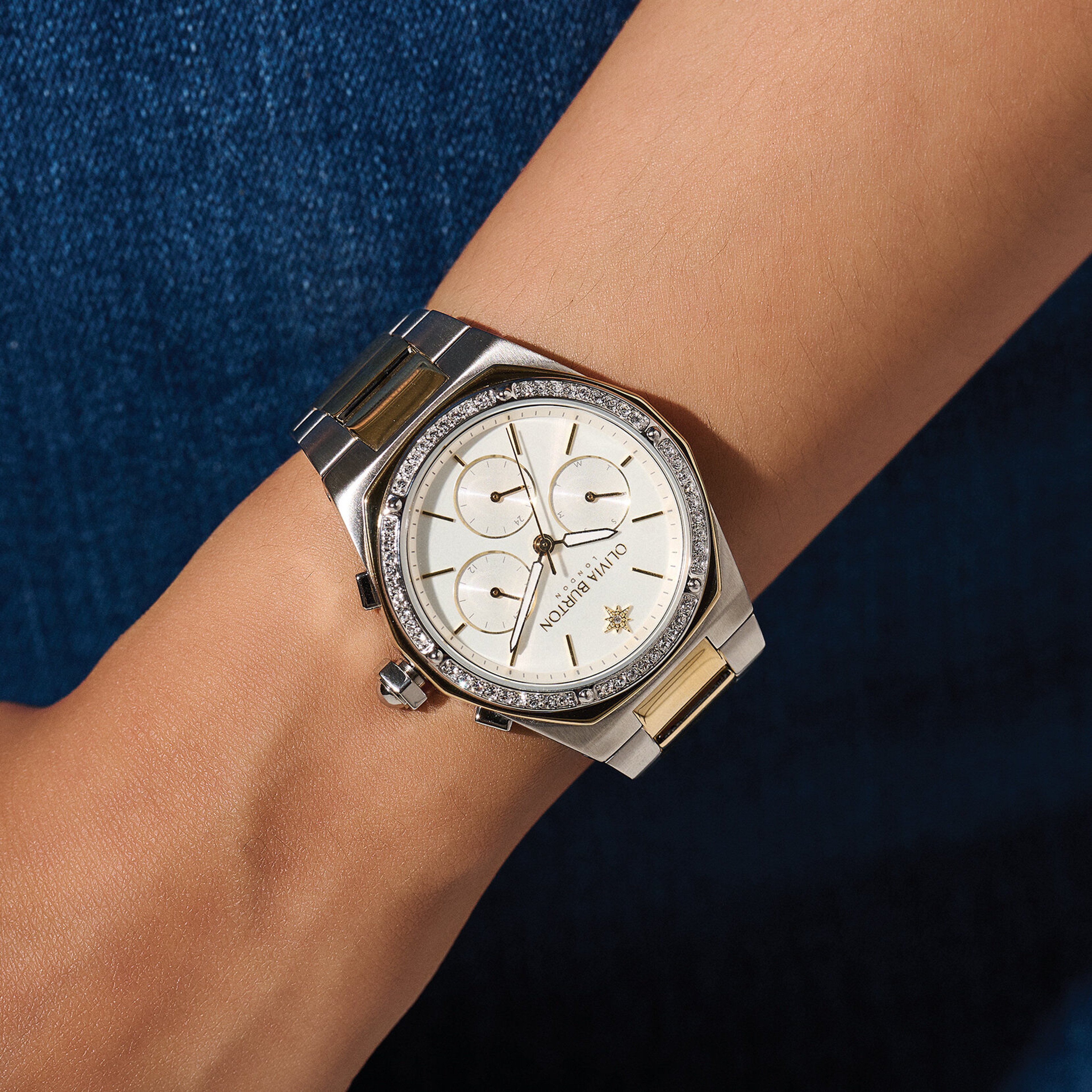 Our bestselling Hexa now comes as a luxurious multi-function dial. A stainless steel and gold-plated bracelet strap gives a cool, contemporary vibe whilst the silver white sunray dial is framed with a crystal bezel for a little extra dazzle. Multi-function tracking features meet luxe style.