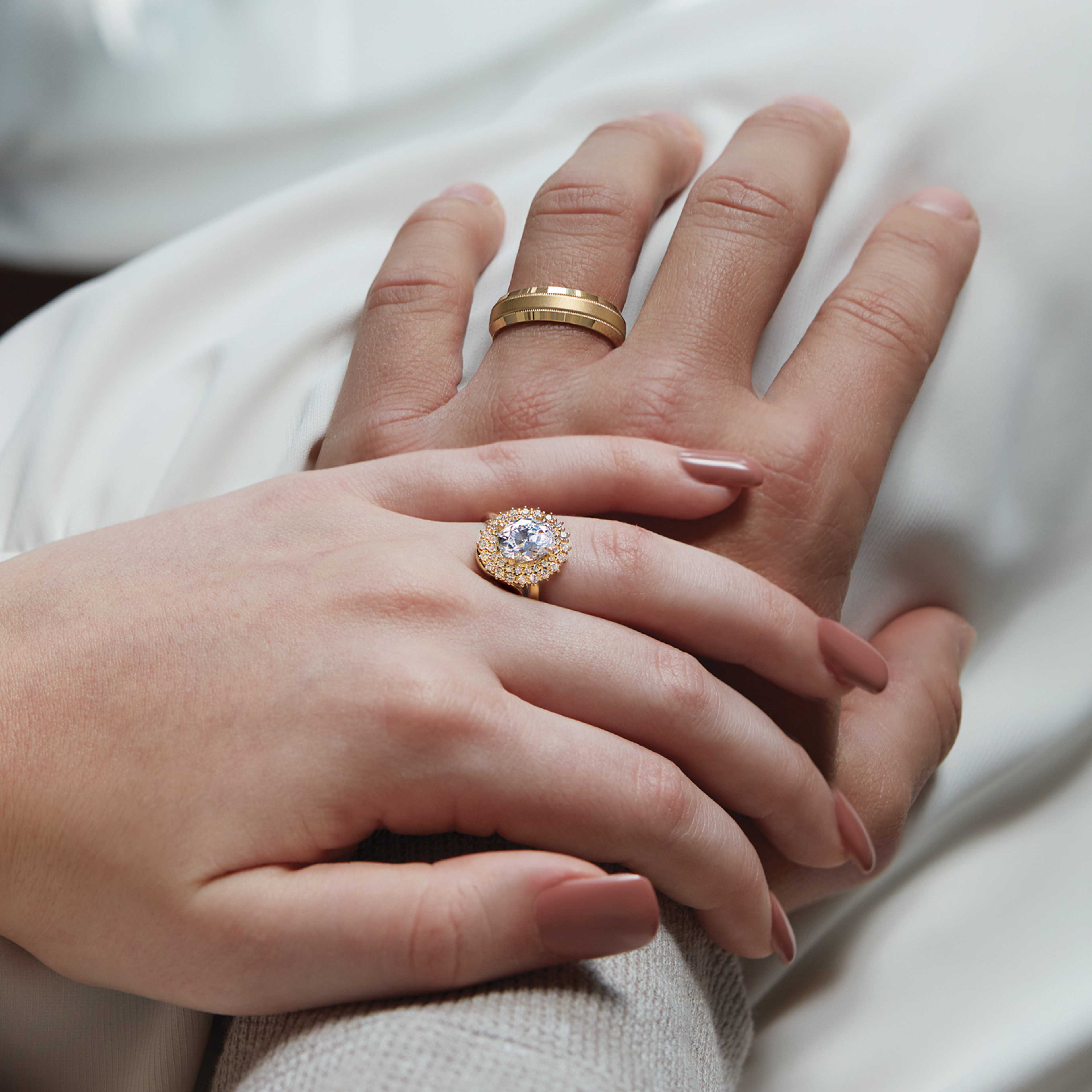 Make your partner feel like part of the British royal family with this vintage-inspired, double halo cathedral ring setting. A magnificent center stone of your choice is elegantly surrounded by double diamond halos that provide plenty of wow factor. The sleek and slender ring band completes the look.