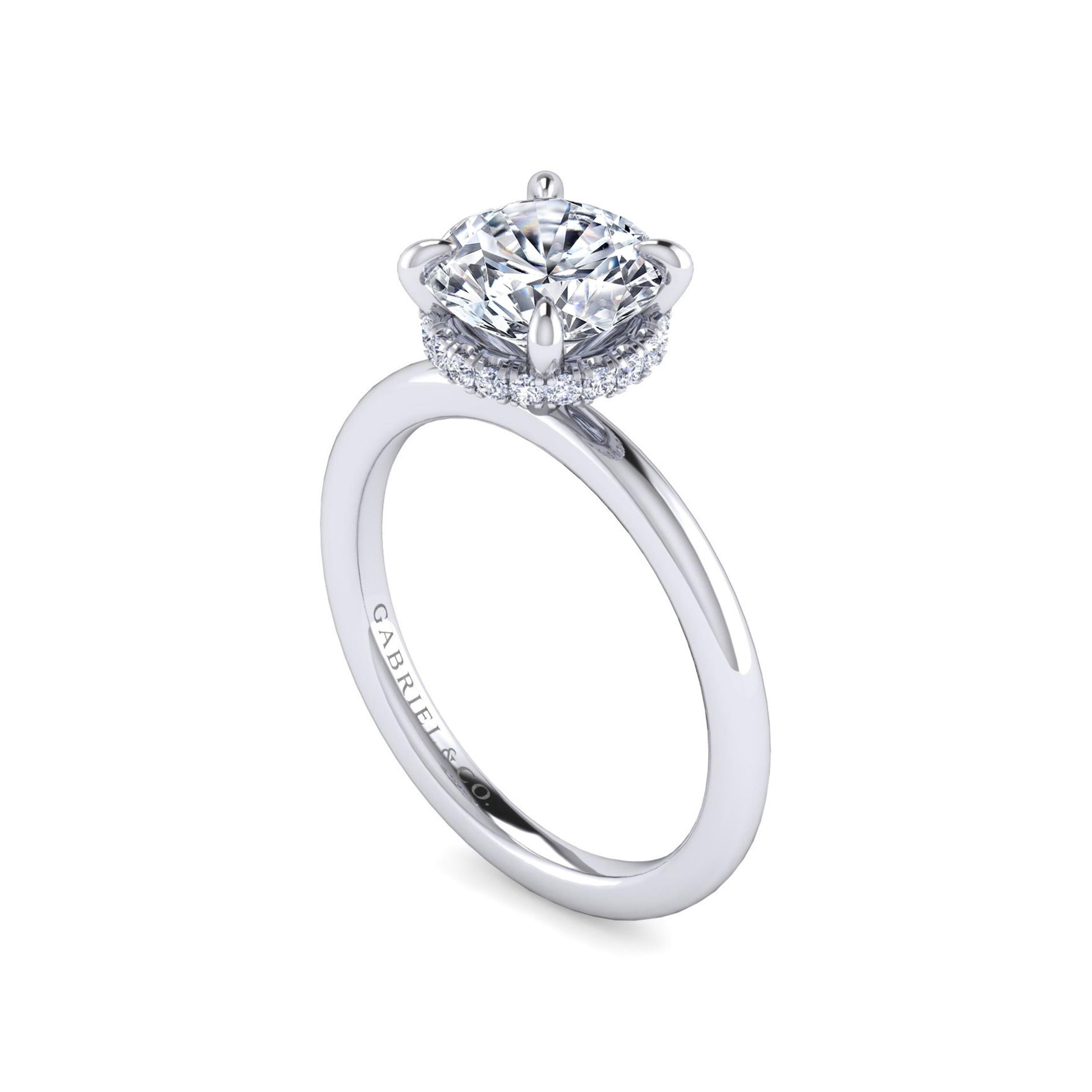 An elegant engagement ring setting that radiates elevated simplicity. This ring features a smooth straight shank and a hidden diamond halo. Share the best kind of secret when you surprise them with this hidden halo engagement ring setting.