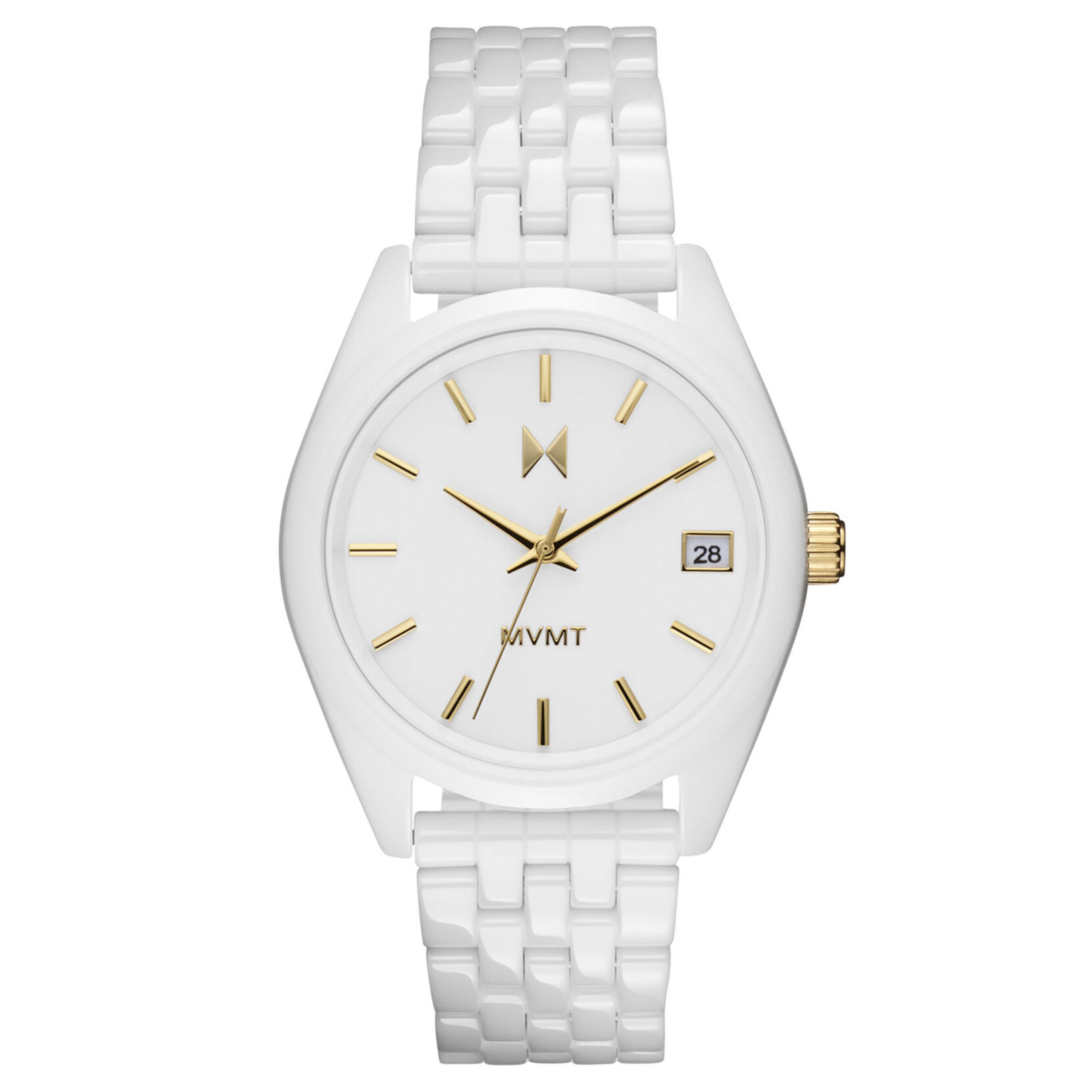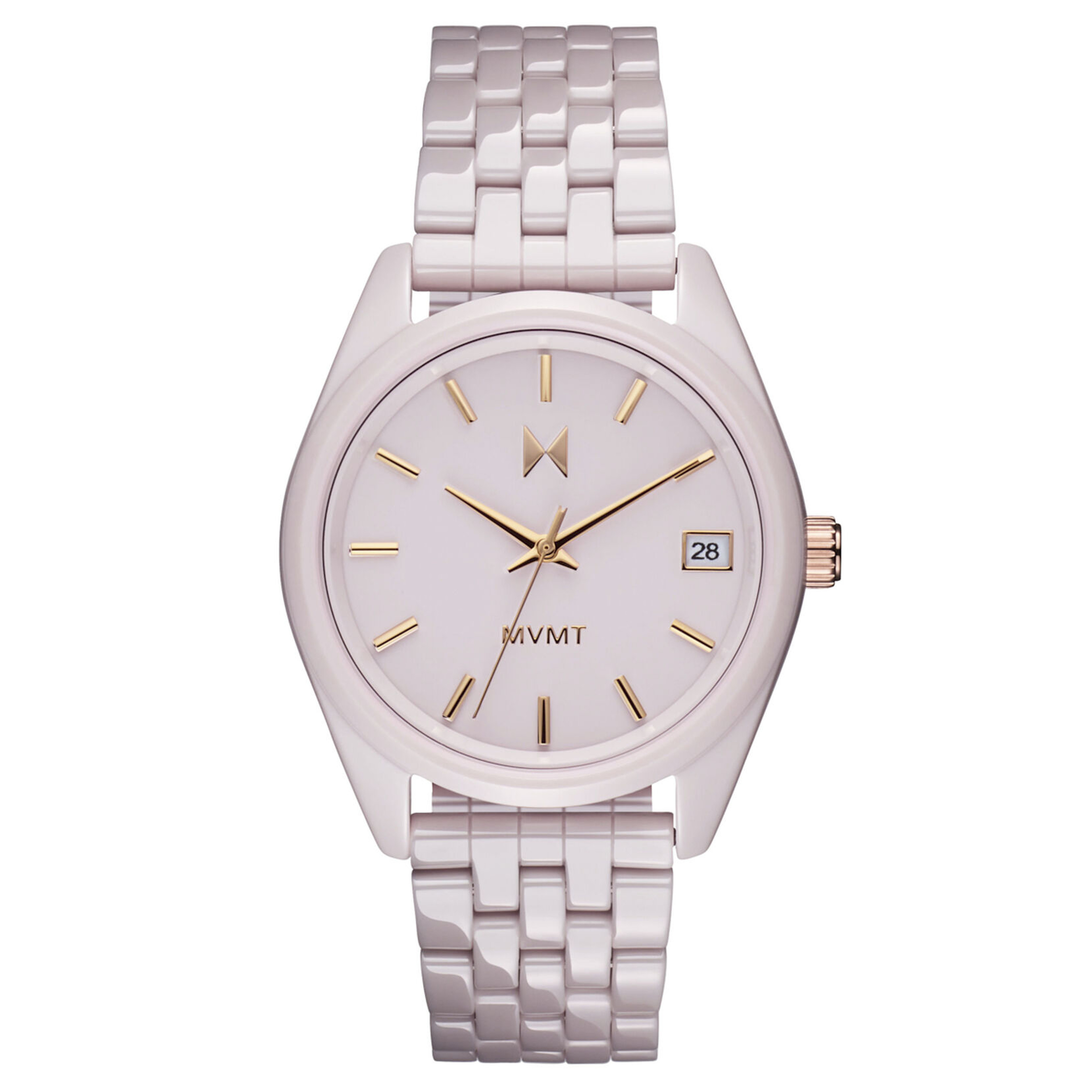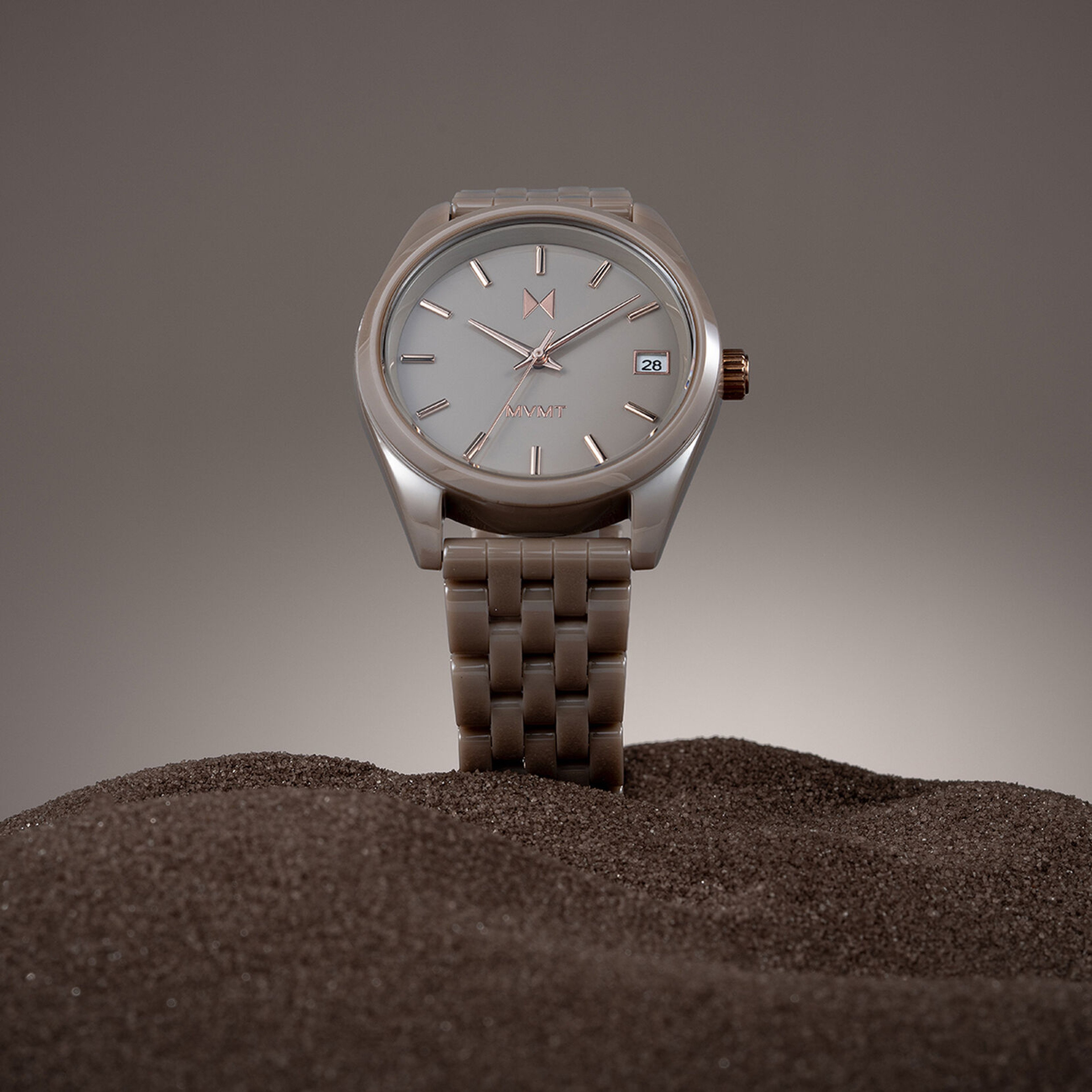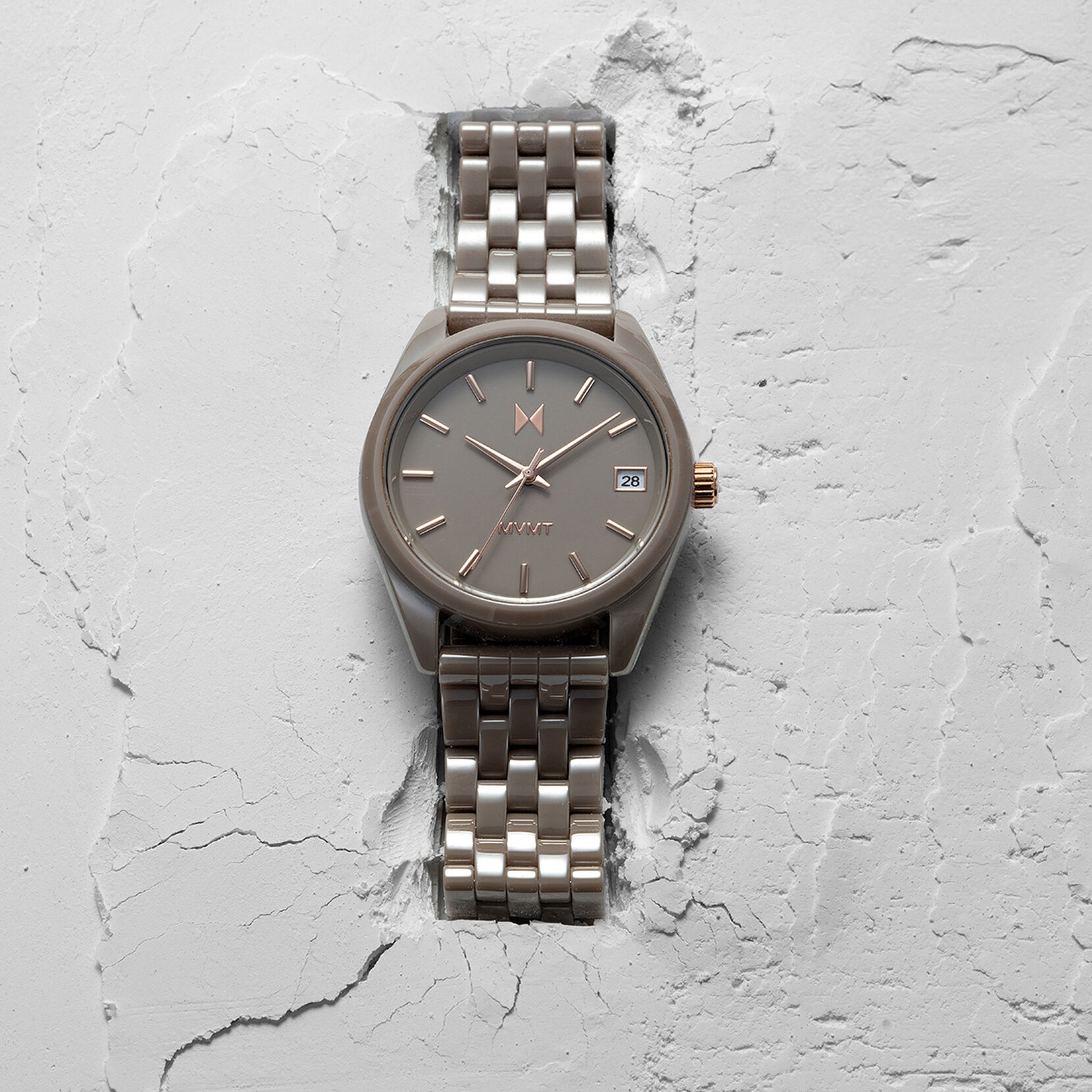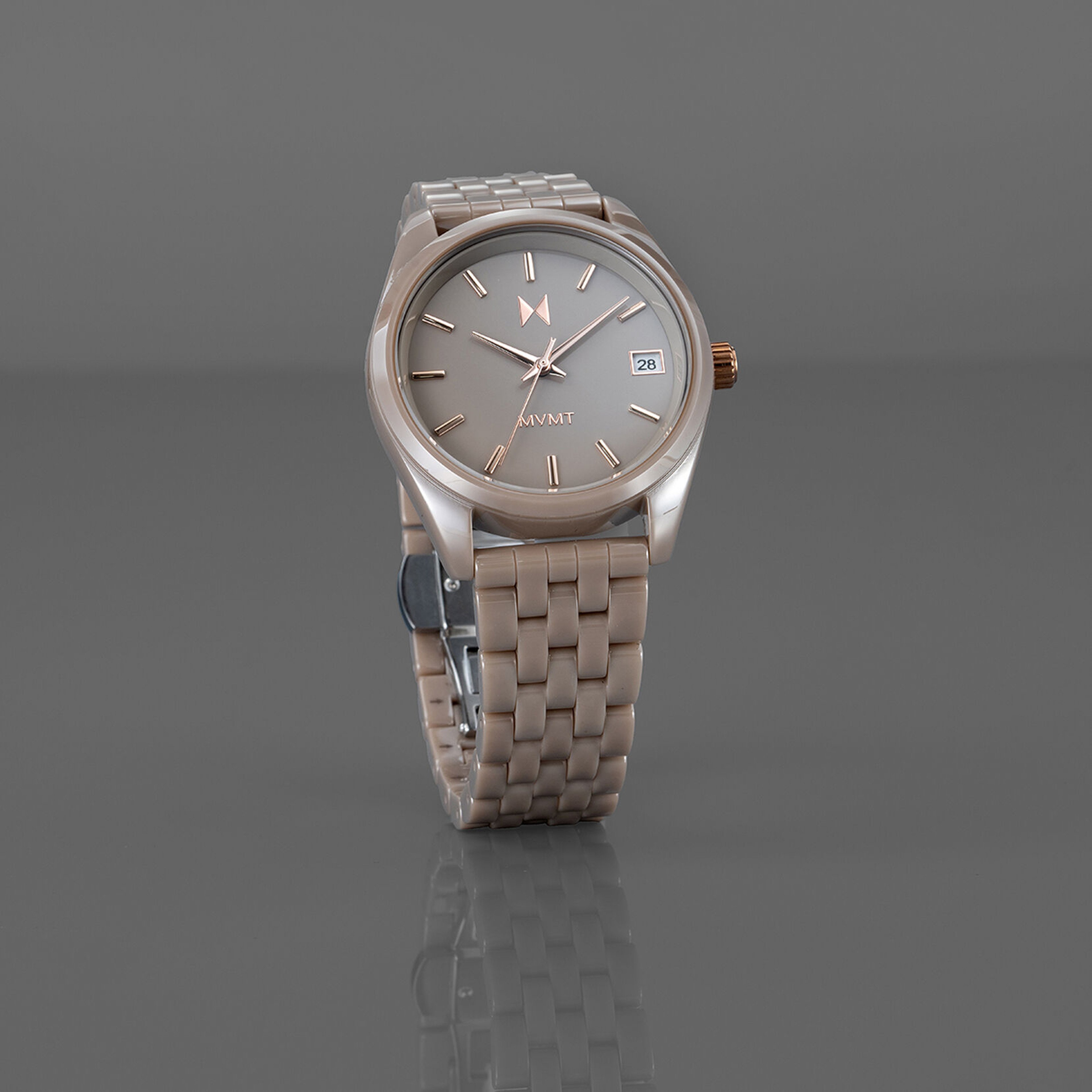 Industry-leading ceramic watches by MVMT. Lighter, harder and glossier than steel. The women’s Rise Boyfriend an effortlessly oversized 36mm women's watch design featuring a 5-link bracelet band, date window, and rich tapered lugs watch meets our high-resistance taupe ceramic material.