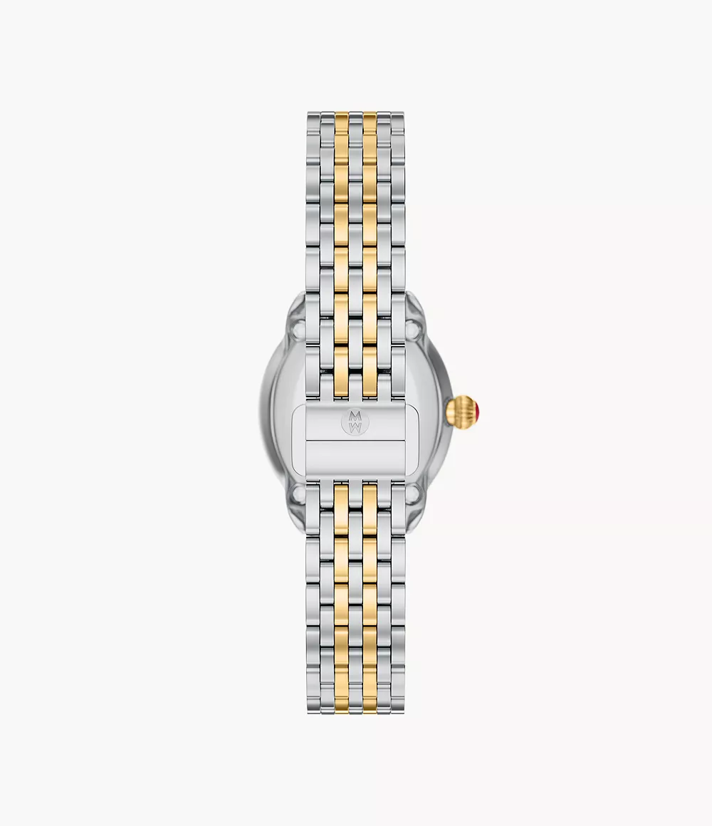 This petite 18K gold-plated and stainless steel two-tone oval timepiece perfectly balances vintage-inspired style with a modern edge. The white mother-of-pearl dial shines with 112 diamond accents (0.38 carat weight) and Swiss movement. The 18K gold-plated and stainless steel two-tone bracelet is made specifically for the Serein Oval collection and is interchangeable with any 12mm MICHELE strap.