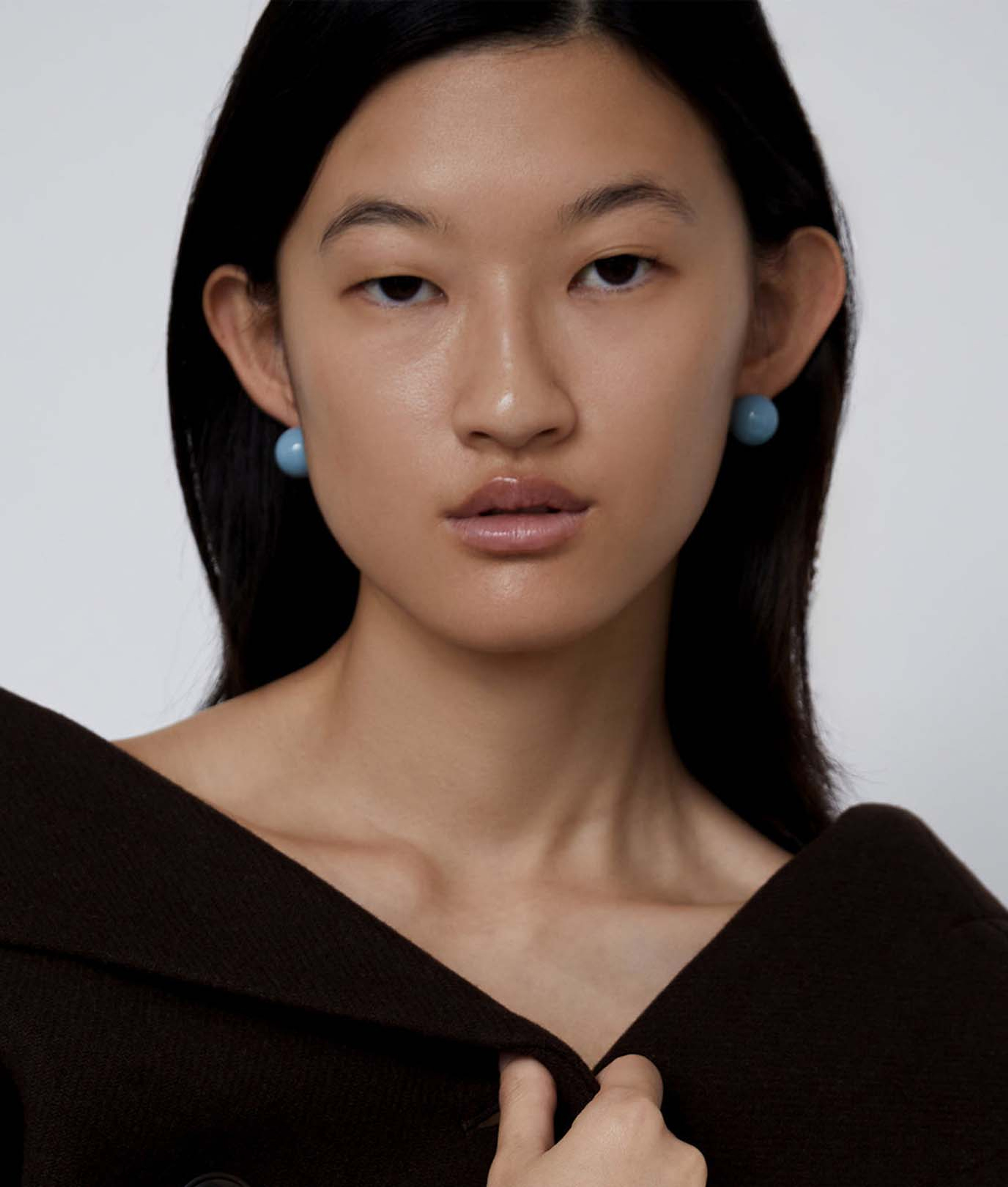 Crafted for the trendsetting individual, these exquisite earrings boast a unique design featuring dual spheres in a mesmerizing French blue hue. The lustrous orbs delicately suspended in a playful yet refined manner, exuding an air of contemporary chicness.