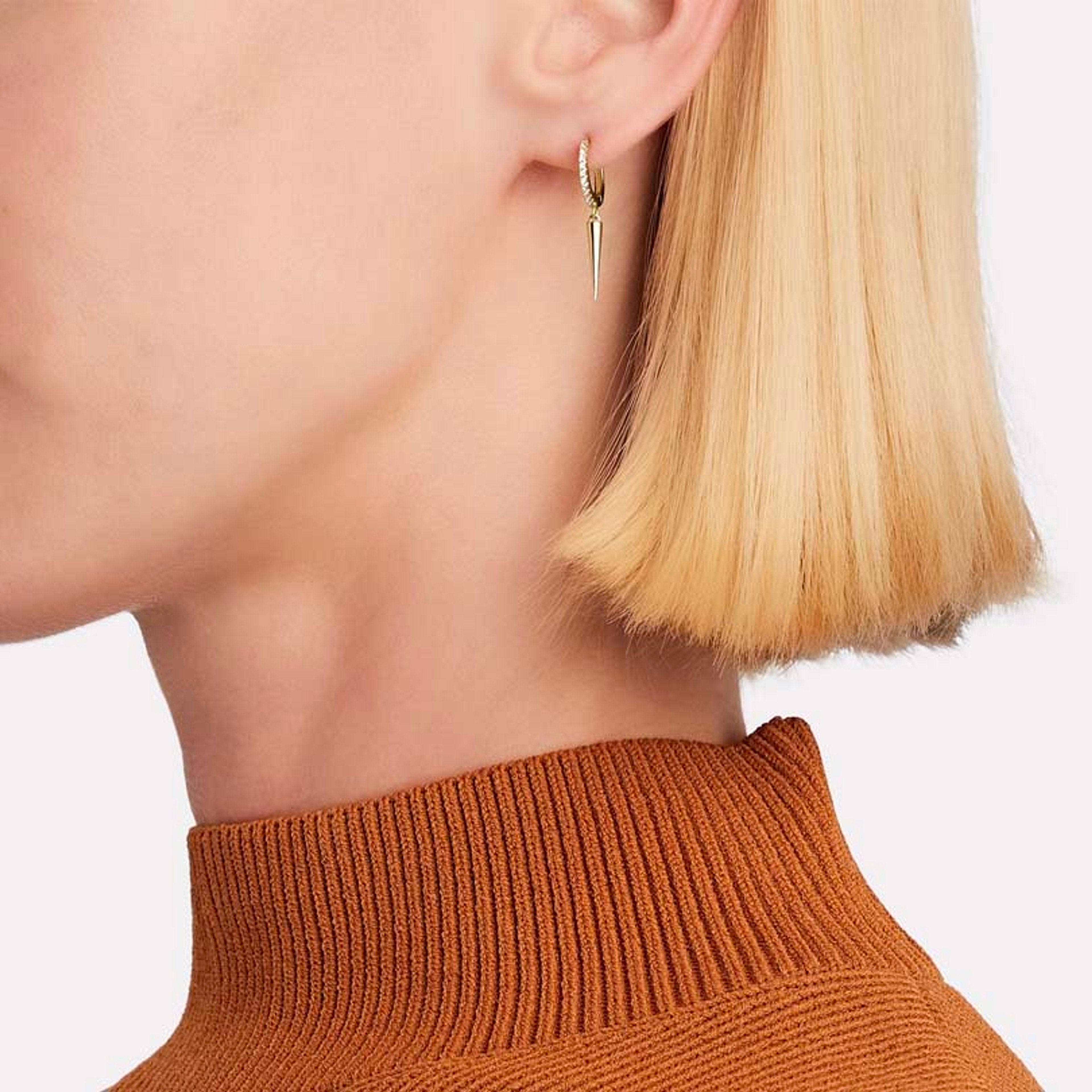 The petite spike on these brilliant huggie hoop earrings will punctuate your look without overdoing it. Pave mini hoops with a delicate mini dagger make these gorgeous earrings a real statement. Perfect with everything from jeans and t-shirt to a little black dress.
