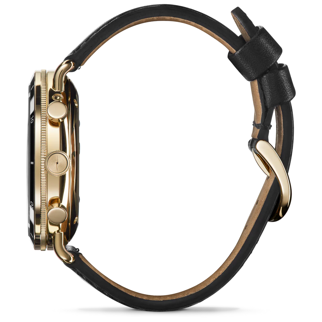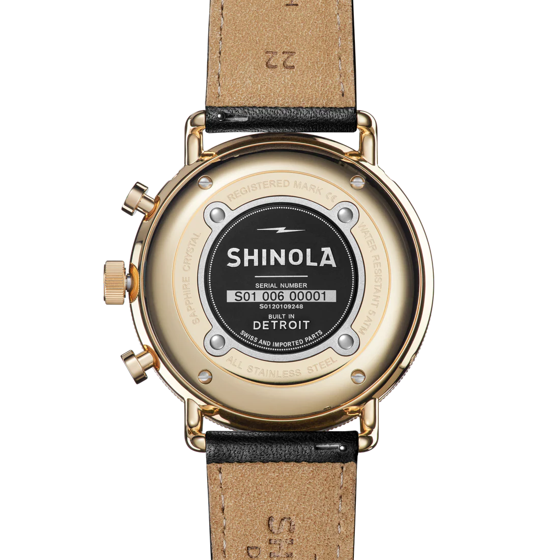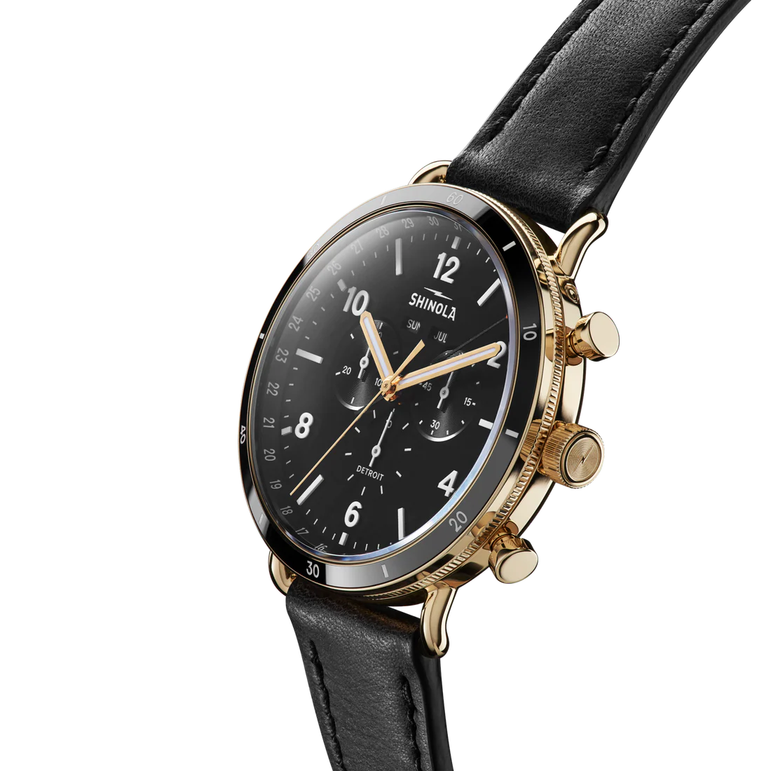 Its all in the details. This 45mm Canfield Sport is designed to strike up conversation. refreshing take on classic timepiece, the Canfield Sport's complexity takes center stage. This chronograph features polished gold PVD case, black ceramic bezel and black dial punctuated with three sub-dials and dual calendar aperture. This bold black and gold watch is instinctively sporty and wardrobe staple.