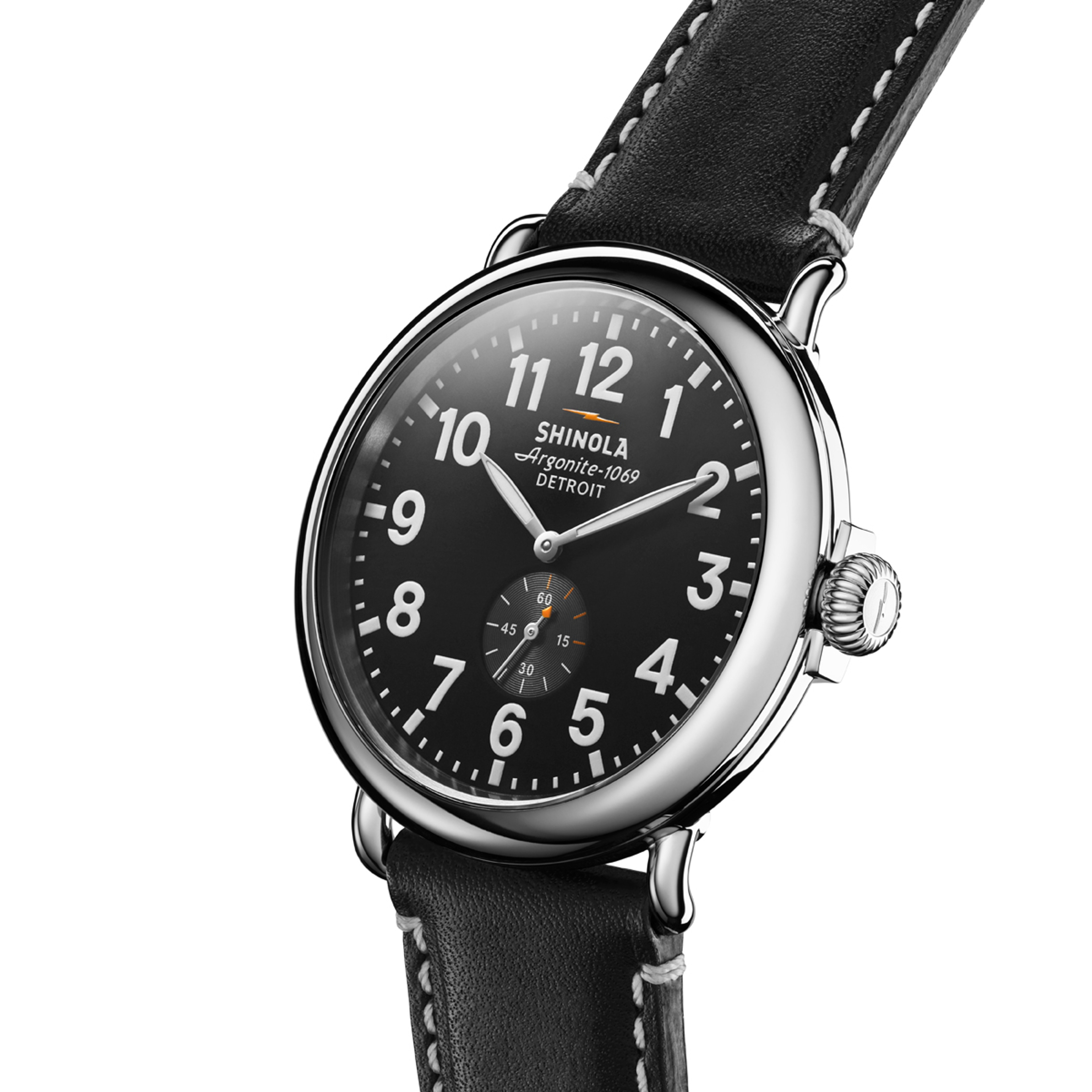 Built to last, named accordingly, this Runwell sports a supremely classic color palette. Two hands and a sub dial are driven by Shinola's Argonite 1069 high-accuracy quartz movement. Double-domed sapphire crystal protects the timepiece from scratches. With the stunning black dial, Super-LumiNova details, the shiny stainless steel, and the leather strap with striking contrast stitching, quality is this timepiece's most apparent characteristic.