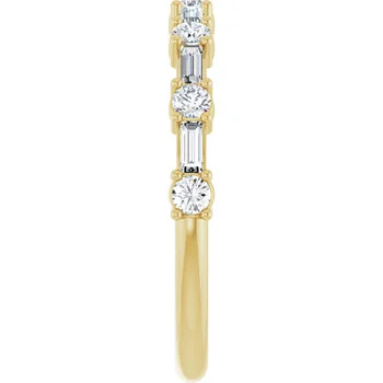 The captivating design of this anniversary ring seamlessly blends the brilliance of round diamonds with the sleek elegance of baguette diamonds. The round diamonds create a dazzling center, radiating light in all directions, while the baguette diamonds add a sophisticated touch with their clean lines and geometric charm.