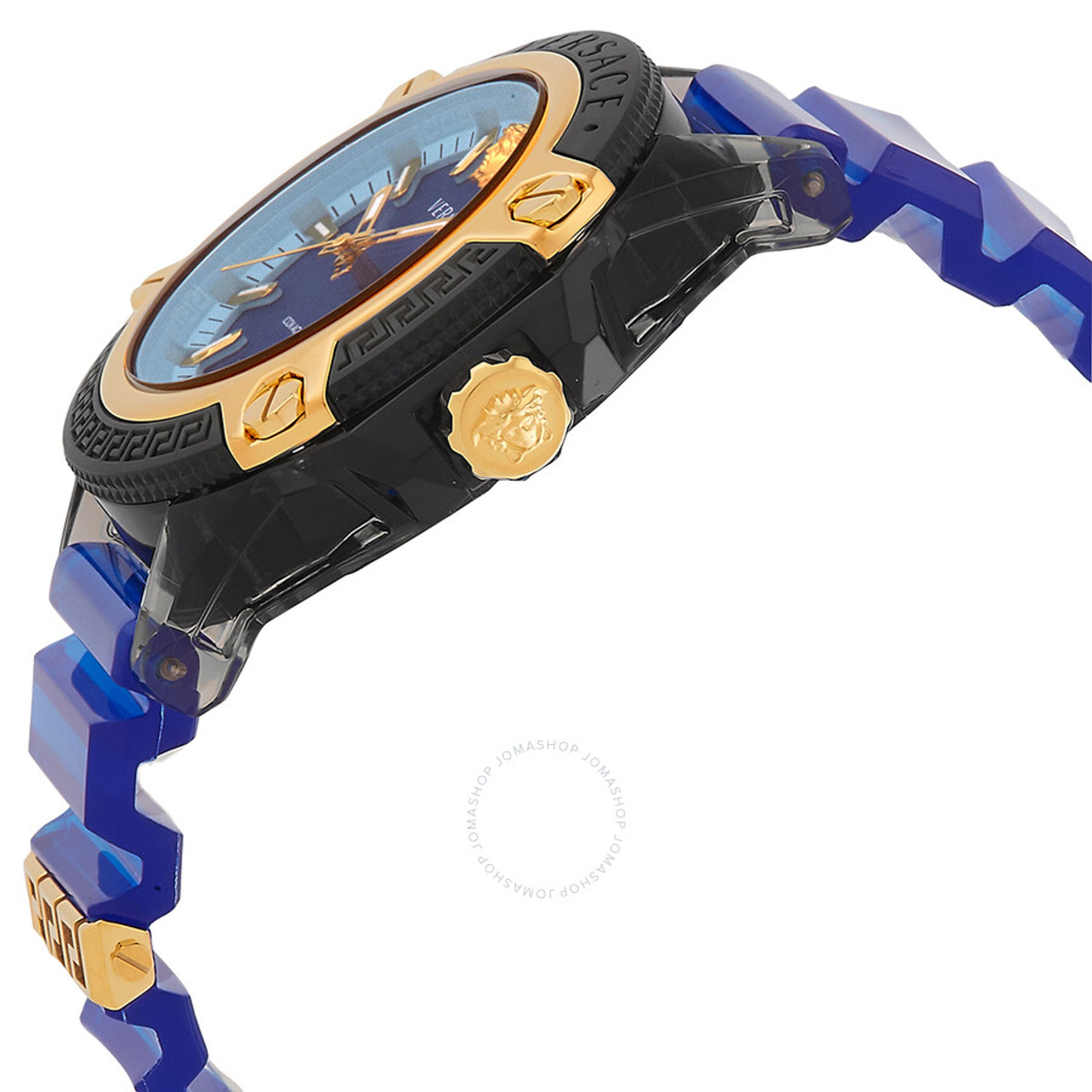 Transparent synthetic case with a blue silicone strap. Fixed black bezel. Blue dial with gold-tone hands and index hour markers. Dial Type: Analog. Luminescent hands and markers. Quartz movement. Scratch resistant sapphire crystal. Solid case back. Round case shape, case size: 42 mm, case thickness: 13 mm. Band width: 22 mm. Buckle clasp. Water resistant at 30 meters / 100 feet. Functions: hour, minute, second. Icon Series. Sport watch style. Watch label: Swiss Made. Versace Icon Quartz Blue Dial Men's Watch VE6E00323.