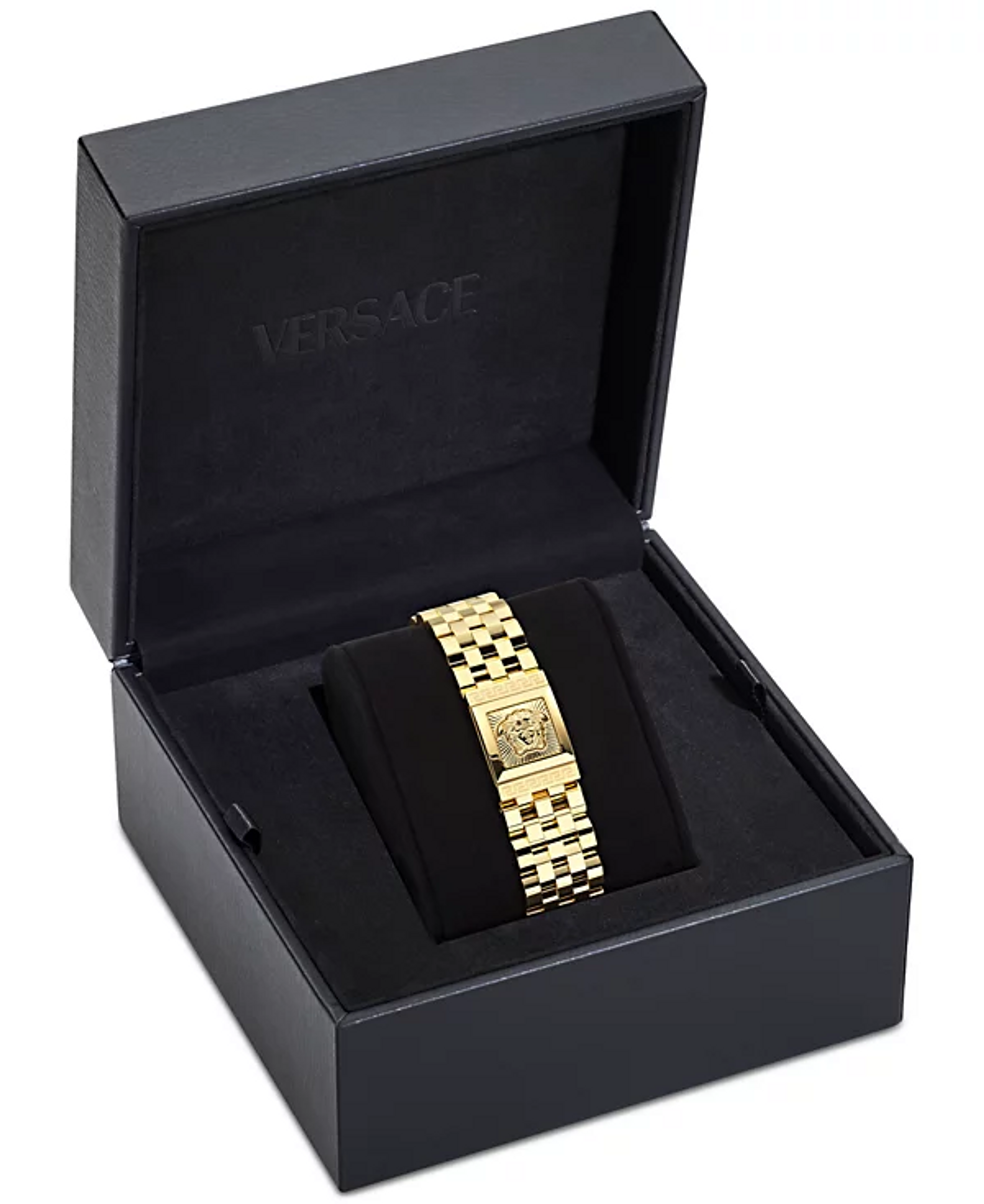 The Versace Reveal watch features a squared dial with the Versace Logo at 12 o'clock concealed by a three-dimensional Medusa closure. The unique design is completed by an intricate mosaic bracelet and an engraved Greca motif on the case. All Versace watches are guaranteed by the 'Swiss Made' marking. All stainless steel is recycled.