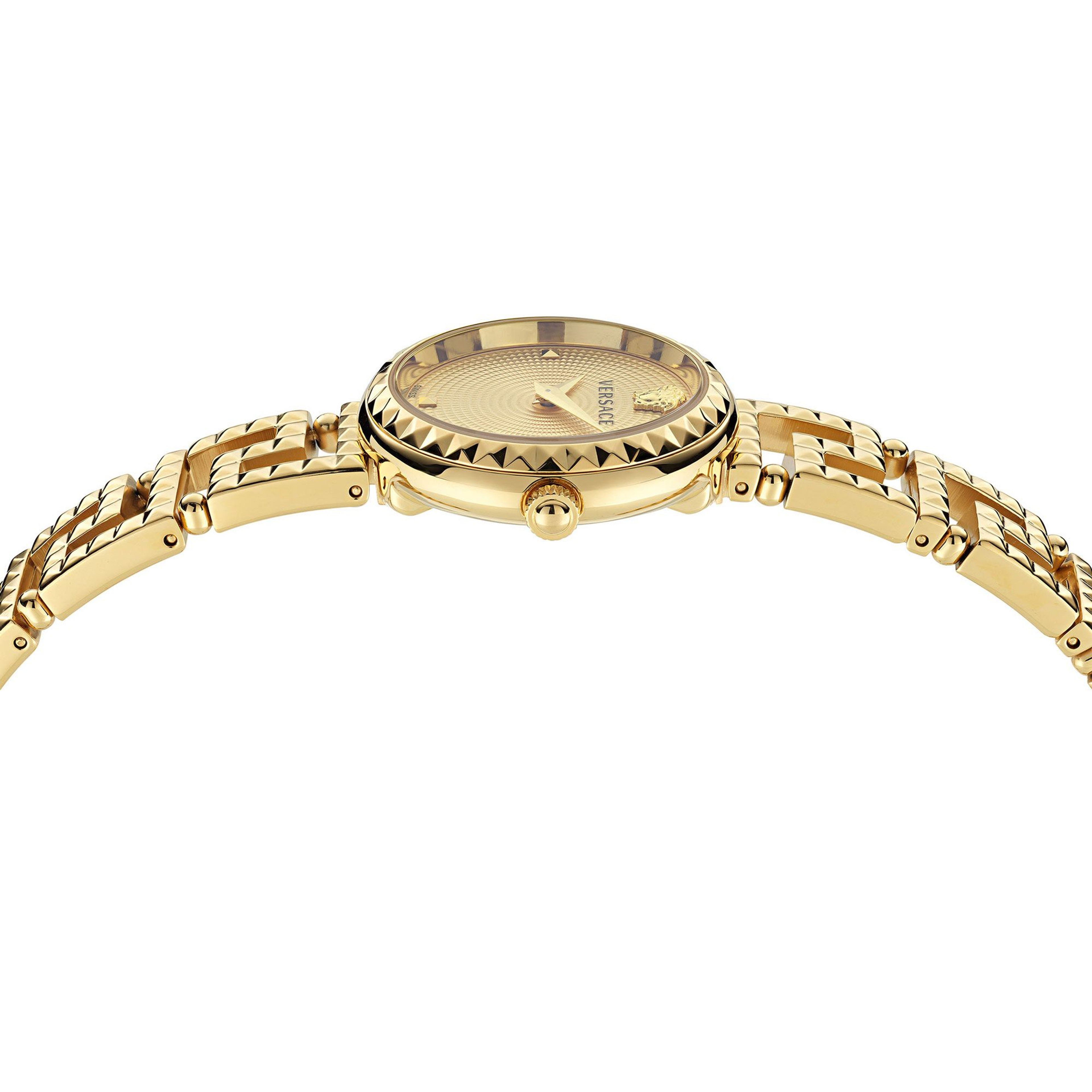 A sophisticated jewelry timepiece featuring a striking Greca bracelet adorned with studs. The case is accented by a bold three-dimensional Medusa at the 12 o’clock position. Every Versace watch proudly bears the prestigious 'Swiss Made' hallmark, ensuring exceptional quality and craftsmanship. Style #VE7A00323